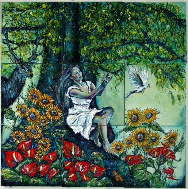 A fairy queen sits under the big Oak in the middleground, sending out a message. She has just kissed the white dove, providing it with fairy dust for protection on it's flight, enabling extra strenght to the doves wings to reach it´s destination safely.