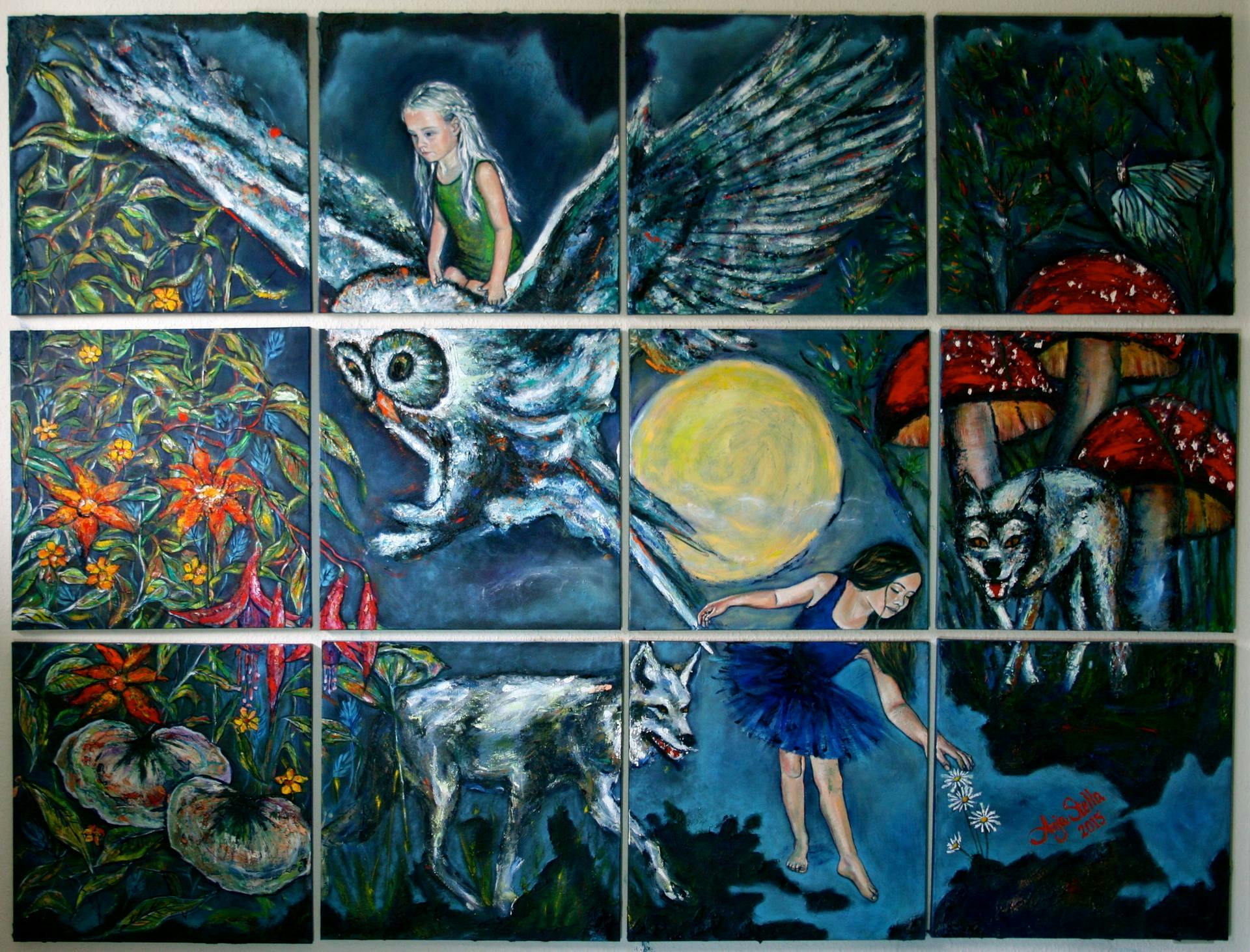 This painting signifies the inner struggles I deal with, when I do what I need to do in order to thrive in life. Painting this work, has been such a struggle for me - and I´m still not sure if I managed to pull it off. I could work on it for 2 more years and still not know for sure. I´m intensely challenged between wanting to do nice work while taming my own raw nature doing so - it somehow got the upper hand in this work. It's my double struggle as a woman that shines through in the images of the two fairies. The fearless one who tames the owl and steers it to success, and the private one, who yearns to focus on the optimistic and beautiful sides of life, while being surrounded by wolves who are ready to attack at any time.
