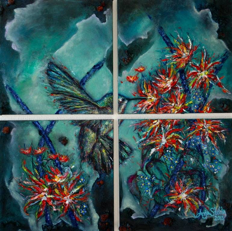 The bird has fought it´s way through the dark green cave, out of the pure urge of wanting to taste the sweetest of nectar. The journey through the cave has torn the bird in all directions.